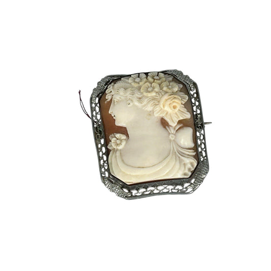 Antique Hand-Carved Shell Cameo Brooch - 800 Silver & Pewter